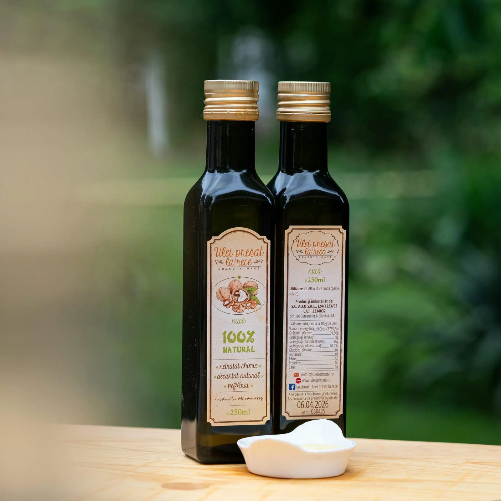 100% natural, decantat natural și nefiltrat, vâscos, de culoare galben-aurie, cu gust intens și plăcut de nuci uscate, achiziționate de la fermieri locali din Transilvania.